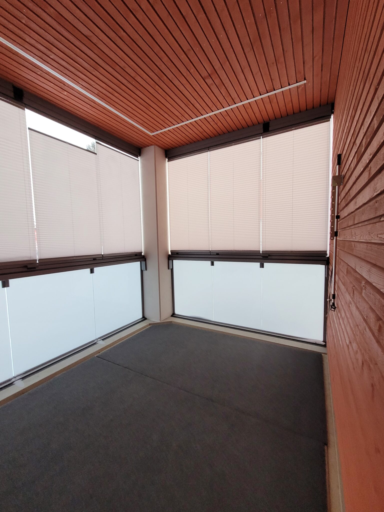 Parvekelasitus sisältää integroidut auringonsuojaverhot. Yläosa kokonaan avautuvaa kirkasta lasia. Alaosa kiinteä, väriltään harmaa. Parvekelasituksen äänieristys 10dB. Valmistaja Lumon.